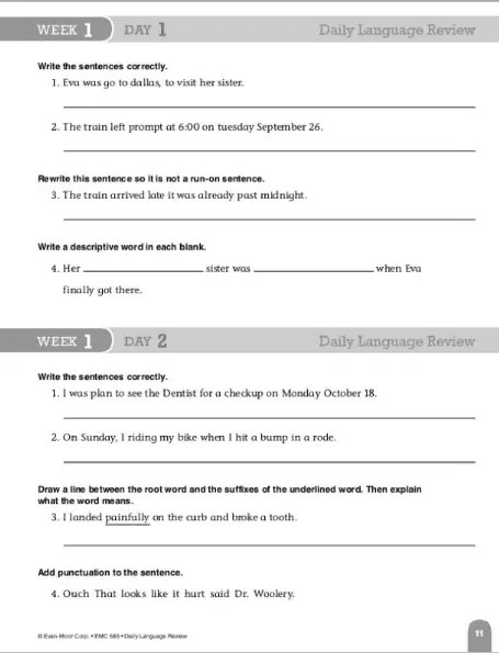 My mother doesn't have enough time to volunteer at school. 2 3 4 5 6 7 8 9 10 11 12 13 14 15 . • review 5 items daily for. In fifth grade, students read closely from a mix of literature and . K5 learning offers free worksheets, flashcards and inexpensive workbooks for kids in kindergarten to grade 5. The grade 5 worksheets include 5th grade math worksheets and fifth grade math games to review addition, subtraction, multiplication, division, decimals, word . Become a member to access additional content . Find out what you need to know. Building spelling skills grade 4 week 24 (2). Fifth grade students practice language skills covering punctuation, verb tense.daily language review: This spiral review is one of the easiest ways to make sure you are covering all of the important grammar and vocabulary standards . 5th grade english language arts skills: Weekly wrap up quiz over the daily language review for 5th grade.